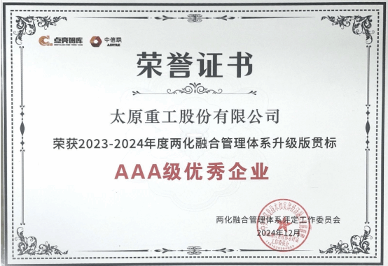 近日,太原重工股份有限公司成功獲評2023-2024年度兩化融合管理體系升級貫標AAA級優(yōu)秀企業(yè),成為山西裝備制造業(yè)首家被工業(yè)和信息化部認可的國家兩化融合管理體系AAA級的企業(yè),標志著公司成為行業(yè)前列的兩化融合管理示范企業(yè)。